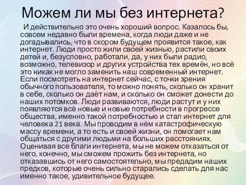 бы, совсем недавно были времена, когда люди даже и не догадывались, что в скором будущем проявится такое, как интернет. Люди просто жили своей жизнью, растили своих детей и, безусловно, работали, да, у них были радио, возможно, телевизор и других устройства тех времён, но всё это никак не могло заменить наш современный интернет. Если посмотреть на интернет сейчас, с точки зрения обычного пользователя, то можно понять, сколько он хранит в себе, сколько он даёт нам, и сколько он сможет донести до наших потомков. Люди развиваются, люди растут и у них появляются всё новые и новые потребности в прогрессе общества, именно такой потребностью и стал интернет для человека 21 века. Мы проводим в нём катастрофическую массу времени, а то есть и своей жизни, он помогает нам общаться с другими людьми на больших расстояниях. Оценивая все благи интернета, мы не можем отказаться от него, конечно, мы сможем прожить без интернета, но отказавшись от него самостоятельно, мы предадим наших предков, которые очень сильно старались сделать для нас именно такое, удивительное будущее.
