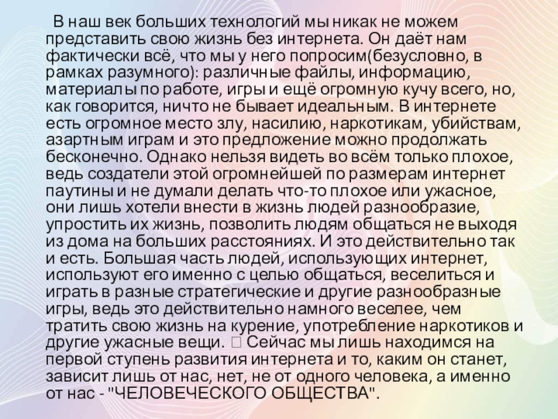 жизнь без интернета. Он даёт нам фактически всё, что мы у него попросим(безусловно, в рамках разумного): различные файлы, информацию, материалы по работе, игры и ещё огромную кучу всего, но, как говорится, ничто не бывает идеальным. В интернете есть огромное место злу, насилию, наркотикам, убийствам, азартным играм и это предложение можно продолжать бесконечно. Однако нельзя видеть во всём только плохое, ведь создатели этой огромнейшей по размерам интернет паутины и не думали делать что-то плохое или ужасное, они лишь хотели внести в жизнь людей разнообразие, упростить их жизнь, позволить людям общаться не выходя из дома на больших расстояниях. И это действительно так и есть. Большая часть людей, использующих интернет, используют его именно с целью общаться, веселиться и играть в разные стратегические и другие разнообразные игры, ведь это действительно намного веселее, чем тратить свою жизнь на курение, употребление наркотиков и другие ужасные вещи. Сейчас мы лишь находимся на первой ступень развития интернета и то, каким он станет, зависит лишь от нас, нет, не от одного человека, а именно от нас - "ЧЕЛОВЕЧЕСКОГО ОБЩЕСТВА".