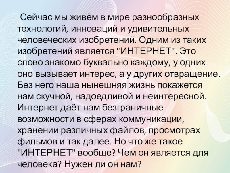 изобретений. Одним из таких изобретений является "ИНТЕРНЕТ". Это слово знакомо буквально каждому, у одних оно вызывает интерес, а у других отвращение. Без него наша нынешняя жизнь покажется нам скучной, надоедливой и неинтересной. Интернет даёт нам безграничные возможности в сферах коммуникации, хранении различных файлов, просмотрах фильмов и так далее. Но что же такое "ИНТЕРНЕТ" вообще? Чем он является для человека? Нужен ли он нам?
