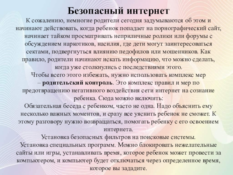 Чтобы всего этого избежать, нужно использовать комплекс мер – родительский контроль. Это комплекс правил и мер по предотвращению негативного воздействия сети интернет на сознание ребенка. Сюда можно включить: