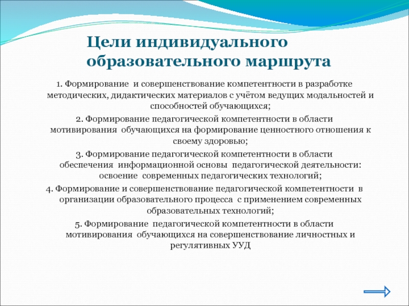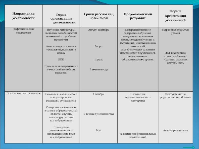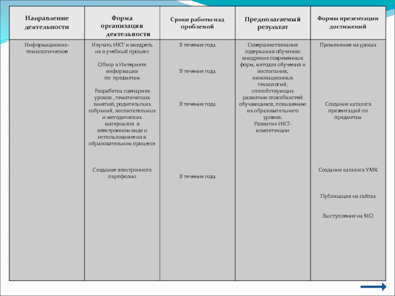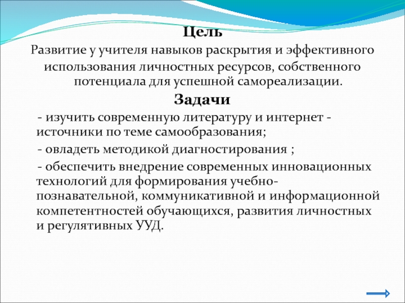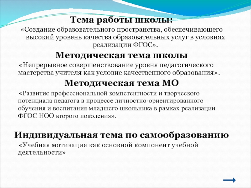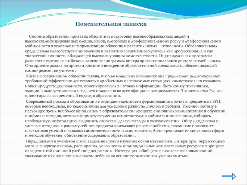 подготовку высокообразованных людей и высококвалифицированных специалистов, способных к профессиональному росту и профессиональной мобильности в условиях информатизации общества и развития новых технологий. Образовательная среда школы способствует становлению и развитию современного учителя как профессионала и как творческой личности, обладающей высоким уровнем компетентности. Индивидуальная программа развития педагога разработана на основе программы центра профессионального роста учителей школы. Она ориентирована на проектирование и внедрение образовательной среды школы, обеспечивающей самоопределение учителя .