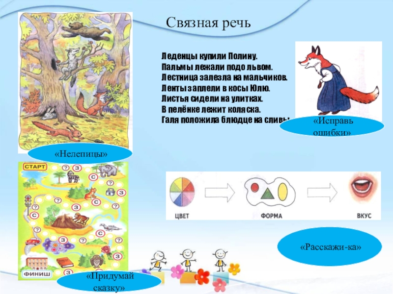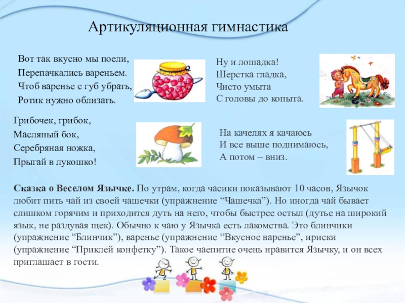 Сказка о Веселом Язычке. По утрам, когда часики показывают 10 часов, Язычок любит пить чай из своей чашечки (упражнение “Чашечка”). Но иногда чай бывает слишком горячим и приходится дуть на него, чтобы быстрее остыл (дутье на широкий язык, не раздувая щек). Обычно к чаю у Язычка есть лакомства. Это блинчики (упражнение “Блинчик”), варенье (упражнение “Вкусное варенье”, ириски (упражнение “Приклей конфетку”). Такое чаепитие очень нравится Язычку, и он всех приглашает в гости.