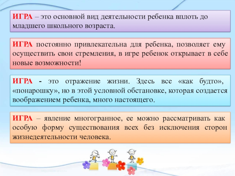 ИГРА постоянно привлекательна для ребенка, позволяет ему осуществить свои стремления, в игре ребенок открывает в себе новые возможности!
