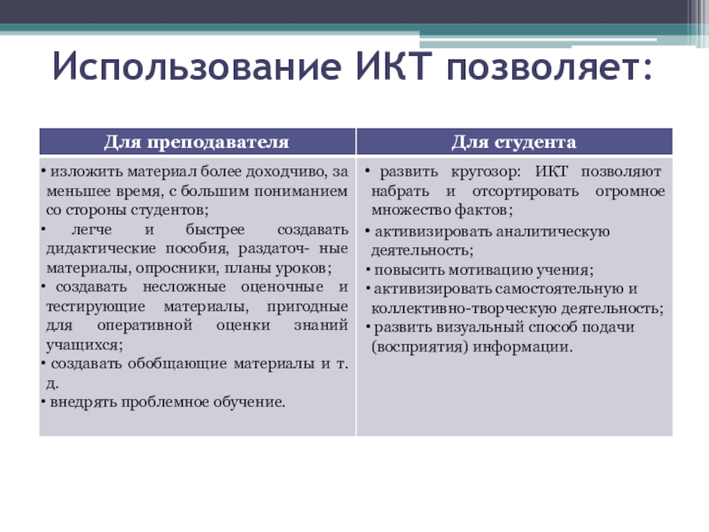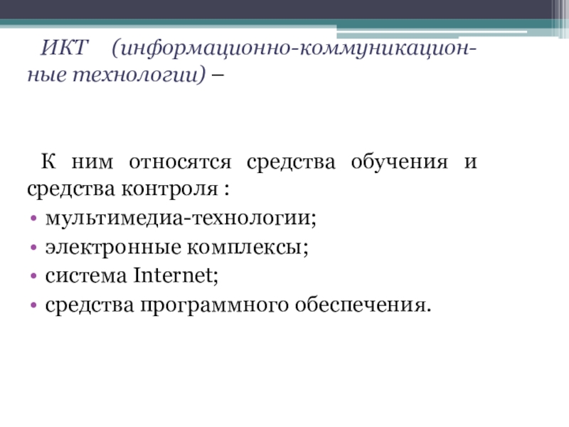 ИКТ (информационно-коммуникацион- ные технологии) – К ним относятся средства обучения и средства контроля : мультимедиа-технологии; электронные комплексы; система Internet; средства программного обеспечения.