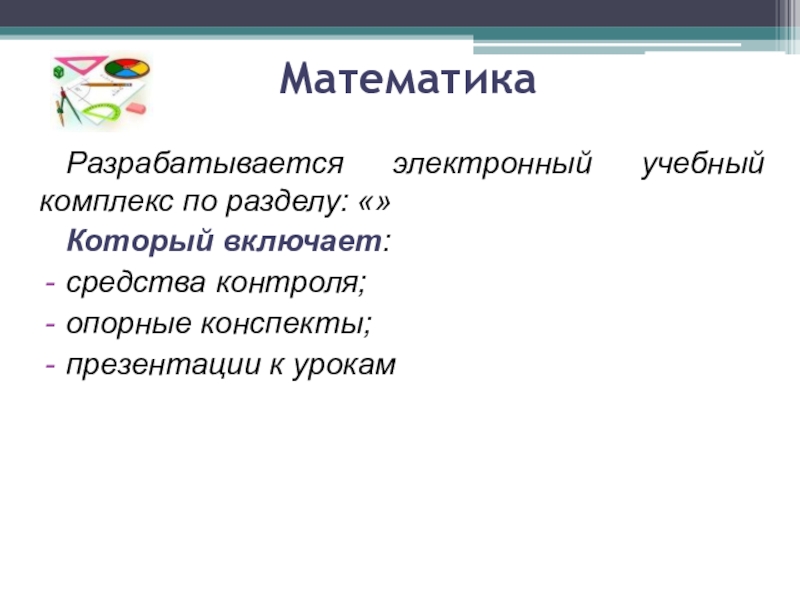 МатематикаРазрабатывается электронный учебный комплекс по разделу: «»Который включает:средства контроля;опорные конспекты;презентации к урокам
