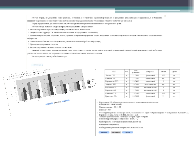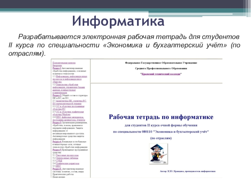 ИнформатикаРазрабатывается электронная рабочая тетрадь для студентов II курса по специальности «Экономика и бухгалтерский учёт» (по отраслям).