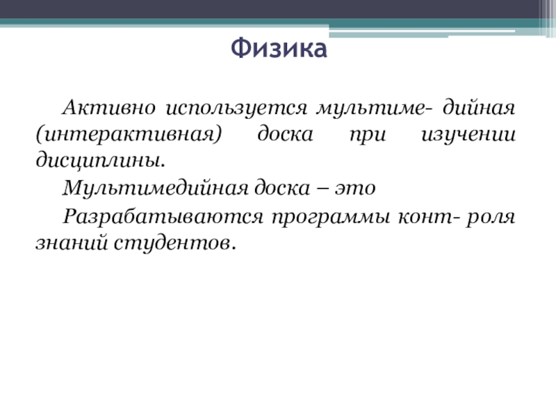 ФизикаАктивно используется мультиме- дийная (интерактивная) доска при изучении дисциплины. Мультимедийная доска – это Разрабатываются программы конт- роля