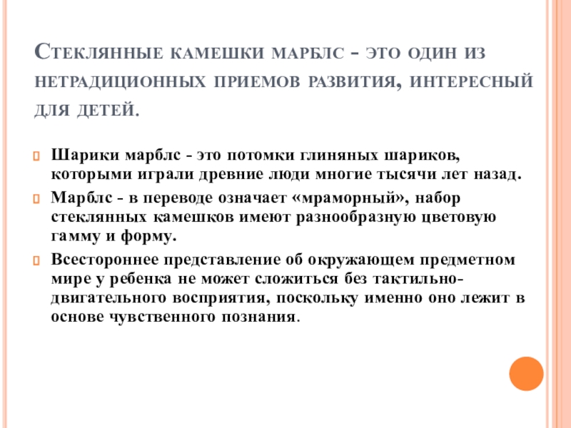 Всестороннее представление об окружающем предметном мире у ребенка не может сложиться без тактильно-двигательного восприятия, поскольку именно оно лежит в основе чувственного познания.