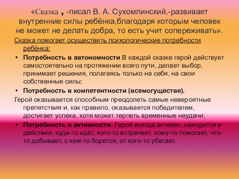 Потребность в автономности.В каждой сказке герой действует самостоятельно на протяжении всего пути, делает выбор, принимает решения, полагаясь только на себя, на свои собственные силы;