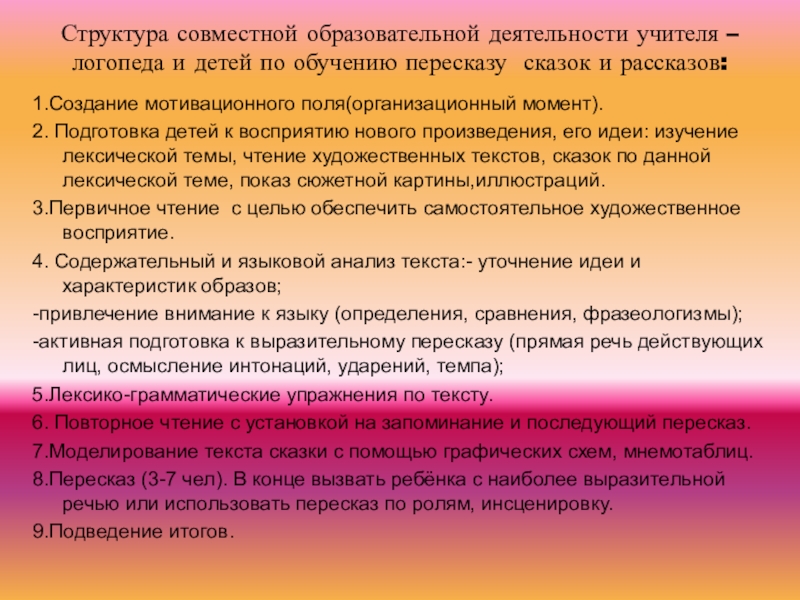 8.Пересказ (3-7 чел). В конце вызвать ребёнка с наиболее выразительной речью или использовать пересказ по ролям, инсценировку.