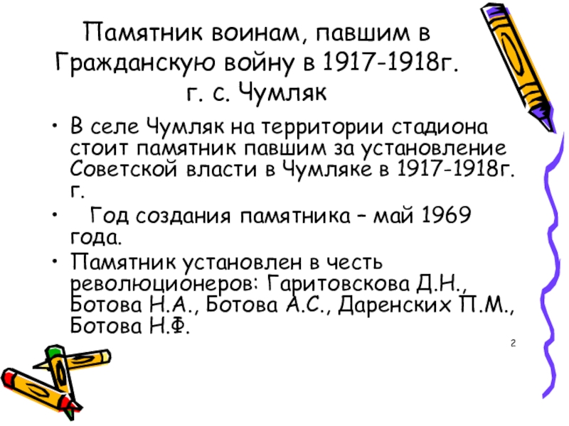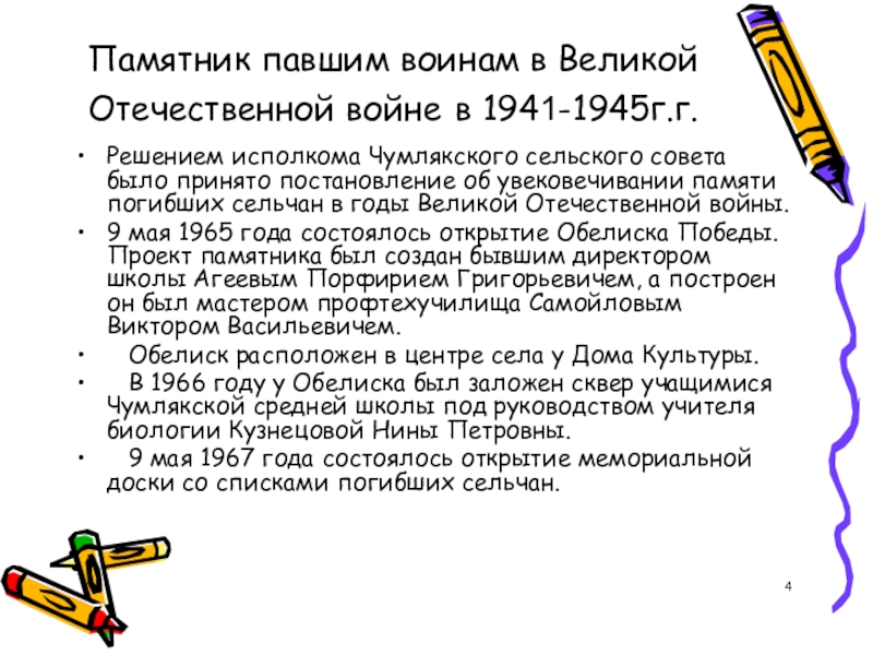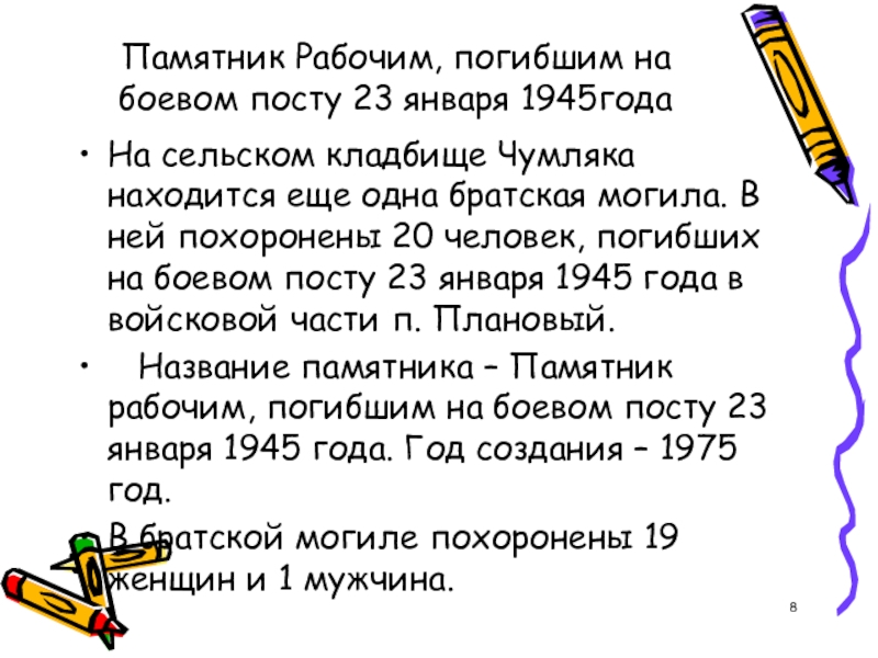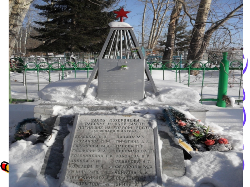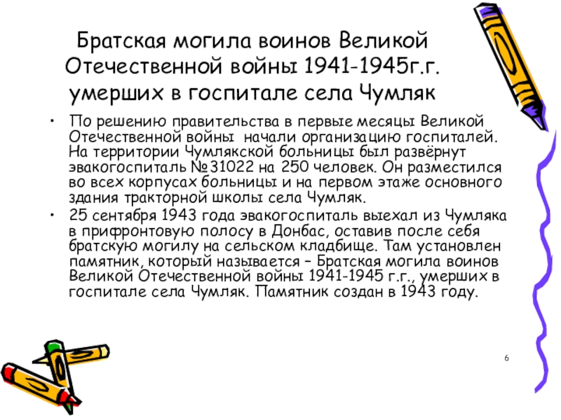 25 сентября 1943 года эвакогоспиталь выехал из Чумляка в прифронтовую полосу в Донбас, оставив после себя братскую могилу на сельском кладбище. Там установлен памятник, который называется – Братская могила воинов Великой Отечественной войны 1941-1945 г.г., умерших в госпитале села Чумляк. Памятник создан в 1943 году.