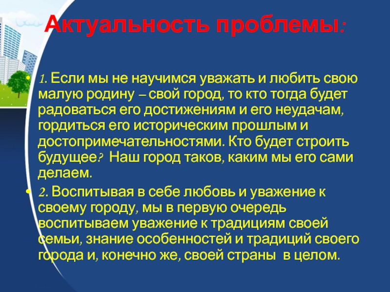 2. Воспитывая в себе любовь и уважение к своему городу, мы в первую очередь воспитываем уважение к традициям своей семьи, знание особенностей и традиций своего города и, конечно же, своей страны в целом.