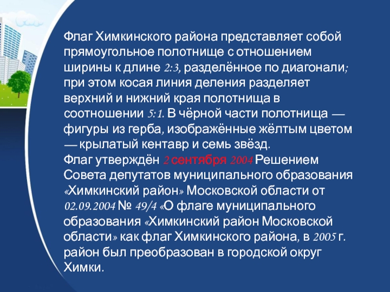 Слайд 35Флаг Химкинского района представляет собой прямоугольное полотнище с отношением ширины к