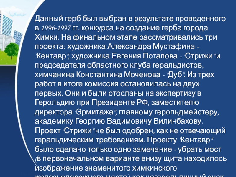 на создание герба города Химки. На финальном этапе рассматривались три проекта: художника Александра Мустафина - "Кентавр", художника Евгения Потапова - "Стрижи" и председателя областного клуба геральдистов, химчанина Константина Моченова - "Дуб". Из трех работ в итоге комиссия остановилась на двух первых. Они и были отосланы на экспертизу в Герольдию при Президенте РФ, заместителю директора "Эрмитажа", главному герольдмейстеру, академику Георгию Вадимовичу Вилинбахову. Проект "Стрижи" не был одобрен, как не отвечающий геральдическим требованиям. Проекту "Кентавр" было сделано только одно замечание - убрать мост (в первоначальном варианте внизу щита находилось изображение знаменитого химкинского железнодорожного моста), как негеральдичный знак.
