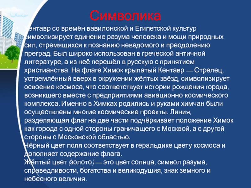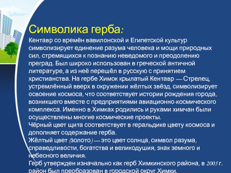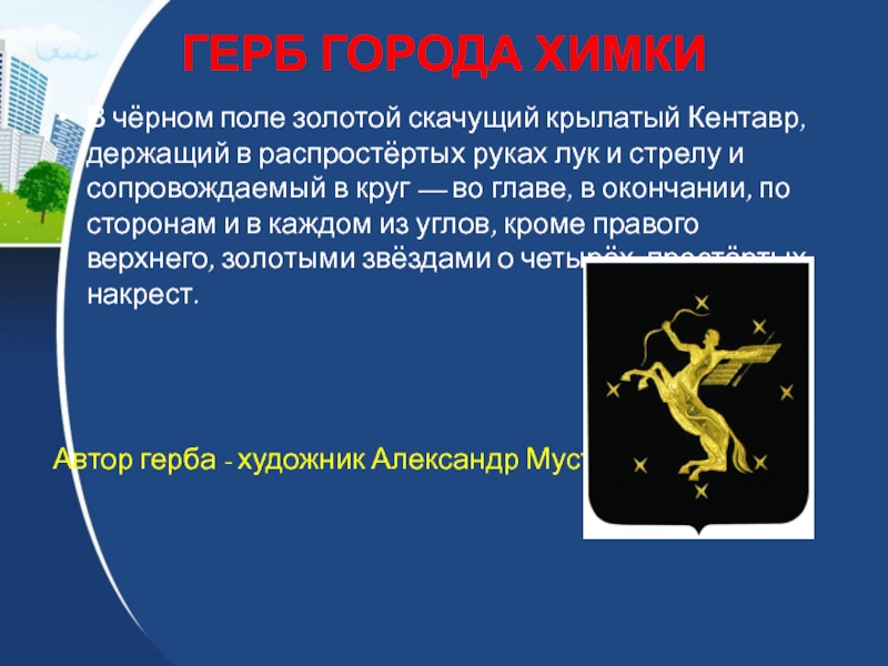 разума человека и мощи природных сил, стремящихся к познанию неведомого и преодолению преград. Был широко использован в греческой античной литературе, а из неё перешёл в русскую с принятием христианства. На гербе Химок крылатый Кентавр — Стрелец, устремлённый вверх в окружении жёлтых звёзд, символизирует освоение космоса, что соответствует истории рождения города, возникшего вместе с предприятиями авиационно-космического комплекса. Именно в Химках родились и руками химчан были осуществлены многие космические проекты.