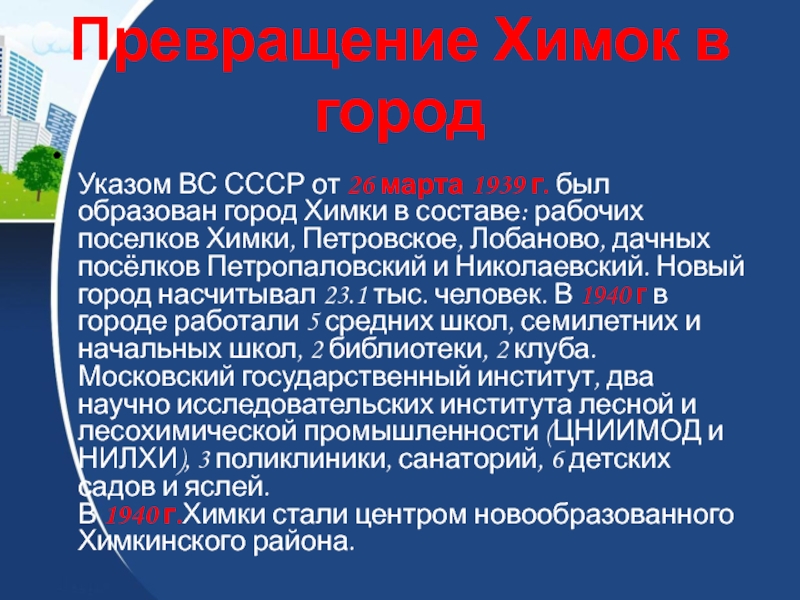 Слайд 17Превращение Химок в город