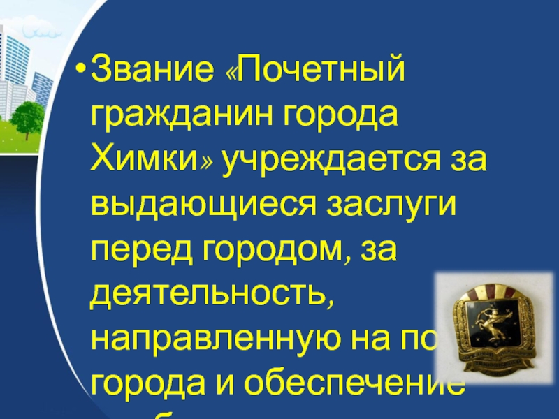Слайд 60Звание «Почетный гражданин города Химки» учреждается за выдающиеся заслуги перед городом,