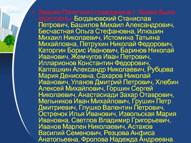 Слайд 62Звания Почетного гражданина г. Химки были удостоены: Богдановский Станислав Петрович, Башилов
