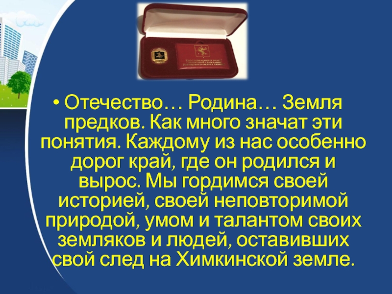 нас особенно дорог край, где он родился и вырос. Мы гордимся своей историей, своей неповторимой природой, умом и талантом своих земляков и людей, оставивших свой след на Химкинской земле.