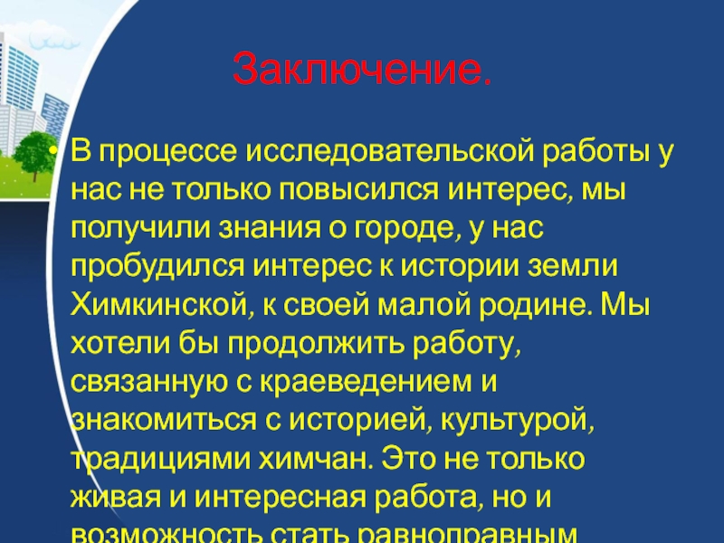 получили знания о городе, у нас пробудился интерес к истории земли Химкинской, к своей малой родине. Мы хотели бы продолжить работу, связанную с краеведением и знакомиться с историей, культурой, традициями химчан. Это не только живая и интересная работа, но и возможность стать равноправным участником поиска, открытия.