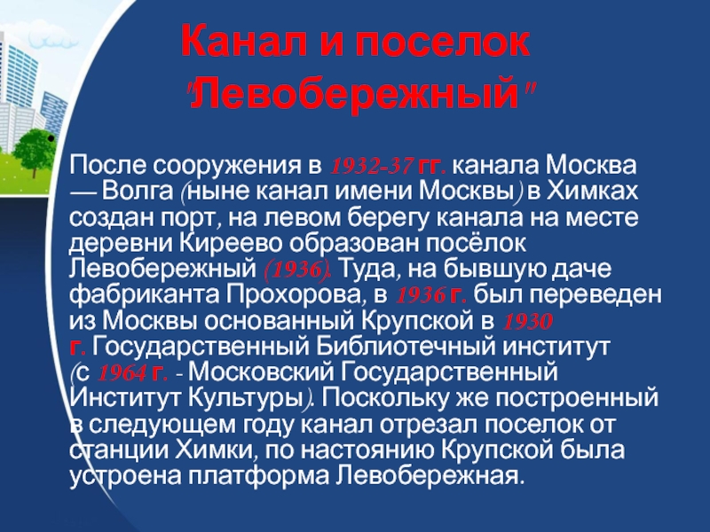 (ныне канал имени Москвы) в Химках создан порт, на левом берегу канала на месте деревни Киреево образован посёлок Левобережный (1936). Туда, на бывшую даче фабриканта Прохорова, в 1936 г. был переведен из Москвы основанный Крупской в 1930 г. Государственный Библиотечный институт (с 1964 г. - Московский Государственный Институт Культуры). Поскольку же построенный в следующем году канал отрезал поселок от станции Химки, по настоянию Крупской была устроена платформа Левобережная.
