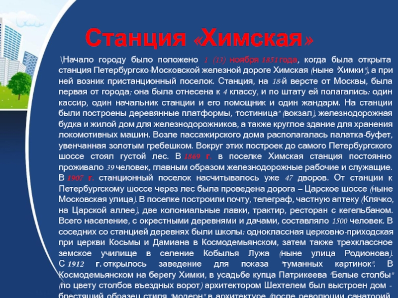 станция Петербургско-Московской железной дороге Химская (ныне "Химки"), а при ней возник пристанционный поселок. Станция, на 18-й версте от Москвы, была первая от города; она была отнесена к 4 классу, и по штату ей полагались: один кассир, один начальник станции и его помощник и один жандарм. На станции были построены деревянные платформы, "гостиница" (вокзал), железнодорожная будка и жилой дом для железнодорожников, а также круглое здание для хранения локомотивных машин. Возле пассажирского дома располагалась палатка-буфет, увенчанная золотым гребешком. Вокруг этих построек до самого Петербургского шоссе стоял густой лес. В 1869 г. в поселке Химская станция постоянно проживало 39 человек, главным образом железнодорожные рабочие и служащие. В 1907 г. станционный поселок насчитывалось уже 47 дворов. От станции к Петербургскому шоссе через лес была проведена дорога – Царское шоссе (ныне Московская улица). В поселке построили почту, телеграф, частную аптеку (Клячко, на Царской аллее), две колониальные лавки, трактир, ресторан с кегельбаном. Всего население, с окрестными деревнями и дачами, составляло 1500 человек. В соседних со станцией деревнях были школы: одноклассная церковно-приходская при церкви Косьмы и Дамиана в Космодемьянском, затем также трехклассное земское училище в селение Кобылья Лужа (ныне улица Родионова).
