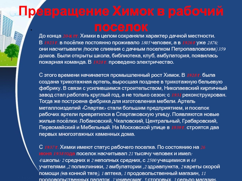 Слайд 13Превращение Химок в рабочий поселок
