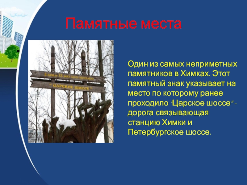 Один из самых неприметных памятников в Химках. Этот памятный знак указывает на место по которому ранее проходило "Царское шоссе" - дорога связывающая станцию Химки и Петербургское шоссе.
