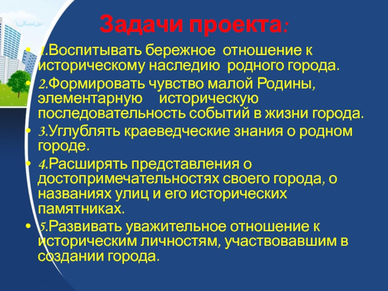 5.Развивать уважительное отношение к историческим личностям, участвовавшим в создании города.