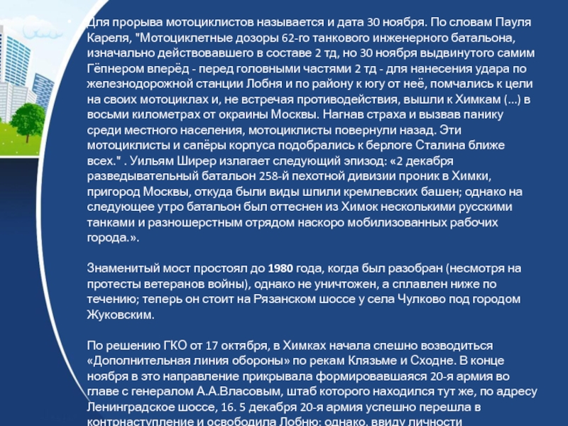 Слайд 19Для прорыва мотоциклистов называется и дата 30 ноября. По словам Пауля