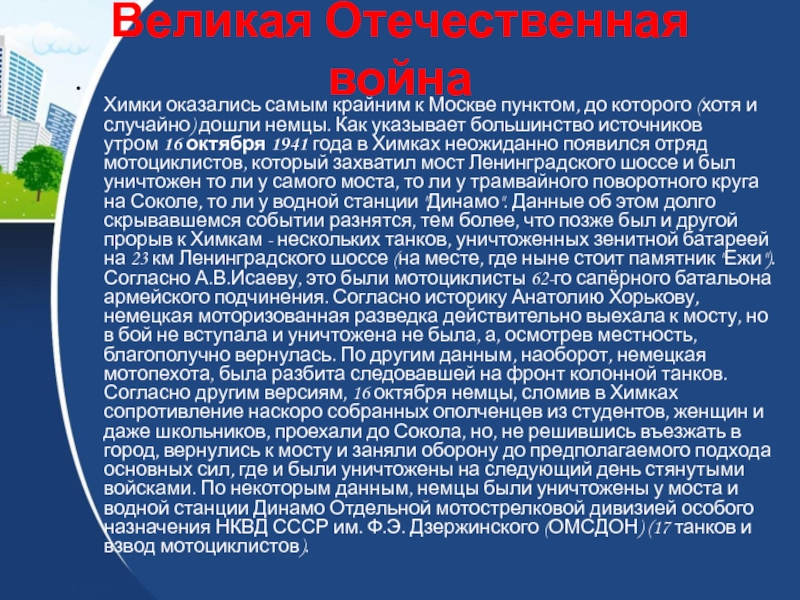 (хотя и случайно) дошли немцы. Как указывает большинство источников утром 16 октября 1941 года в Химках неожиданно появился отряд мотоциклистов, который захватил мост Ленинградского шоссе и был уничтожен то ли у самого моста, то ли у трамвайного поворотного круга на Соколе, то ли у водной станции "Динамо". Данные об этом долго скрывавшемся событии разнятся, тем более, что позже был и другой прорыв к Химкам - нескольких танков, уничтоженных зенитной батареей на 23 км Ленинградского шоссе (на месте, где ныне стоит памятник "Ежи"). Согласно А.В.Исаеву, это были мотоциклисты 62-го сапёрного батальона армейского подчинения. Согласно историку Анатолию Хорькову, немецкая моторизованная разведка действительно выехала к мосту, но в бой не вступала и уничтожена не была, а, осмотрев местность, благополучно вернулась. По другим данным, наоборот, немецкая мотопехота, была разбита следовавшей на фронт колонной танков. Согласно другим версиям, 16 октября немцы, сломив в Химках сопротивление наскоро собранных ополченцев из студентов, женщин и даже школьников, проехали до Сокола, но, не решившись въезжать в город, вернулись к мосту и заняли оборону до предполагаемого подхода основных сил, где и были уничтожены на следующий день стянутыми войсками. По некоторым данным, немцы были уничтожены у моста и водной станции Динамо Отдельной мотострелковой дивизией особого назначения НКВД СССР им. Ф.Э. Дзержинского (ОМСДОН) (17 танков и взвод мотоциклистов).