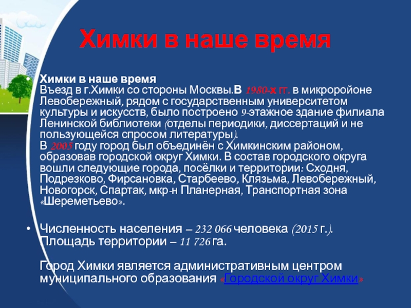 Слайд 28Химки в наше время