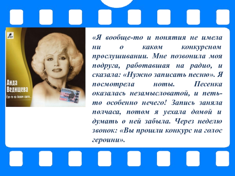 Мне позвонила моя подруга, работавшая на радио, и сказала: «Нужно записать песню». Я посмотрела ноты. Песенка оказалась незамысловатой, и петь-то особенно нечего! Запись заняла полчаса, потом я уехала домой и думать о ней забыла. Через неделю звонок: «Вы прошли конкурс на голос героини».