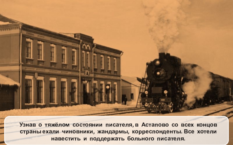 Слайд 10Узнав о тяжёлом состоянии писателя, в Астапово со всех концов страны