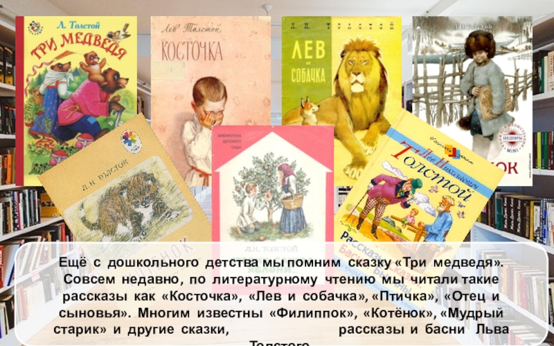по литературному чтению мы читали такие рассказы как «Косточка», «Лев и собачка», «Птичка», «Отец и сыновья». Многим известны «Филиппок», «Котёнок», «Мудрый старик» и другие сказки, рассказы и басни Льва Толстого.