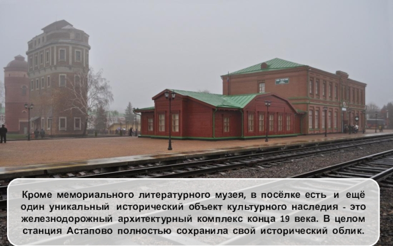 один уникальный исторический объект культурного наследия - это железнодорожный архитектурный комплекс конца 19 века. В целом станция Астапово полностью сохранила свой исторический облик.