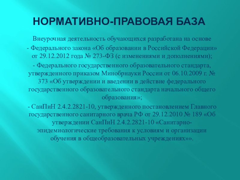Нормативно-правовая базаВнеурочная деятельность обучающихся разработана на основе - Федерального закона «Об образовании в Российской Федерации» от 29.12.2012
