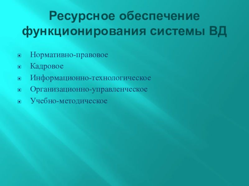 Ресурсное обеспечение функционирования системы ВДНормативно-правовоеКадровоеИнформационно-технологическоеОрганизационно-управленческоеУчебно-методическое