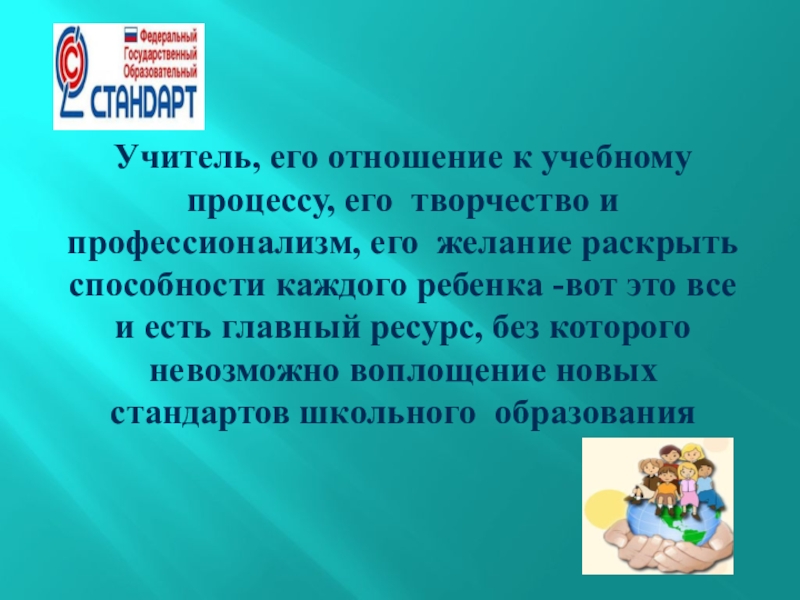 желание раскрыть способности каждого ребенка -вот это все и есть главный ресурс, без которого невозможно воплощение новых стандартов школьного образования
