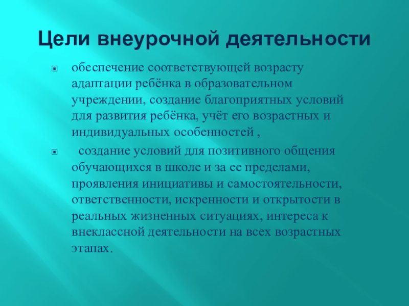 Цели внеурочной деятельностиобеспечение соответствующей возрасту адаптации ребёнка в образовательном учреждении, создание благоприятных условий для развития ребёнка, учёт