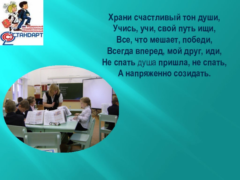 Храни счастливый тон души,Учись, учи, свой путь ищи, Все, что мешает, победи, Всегда вперед, мой друг, иди,