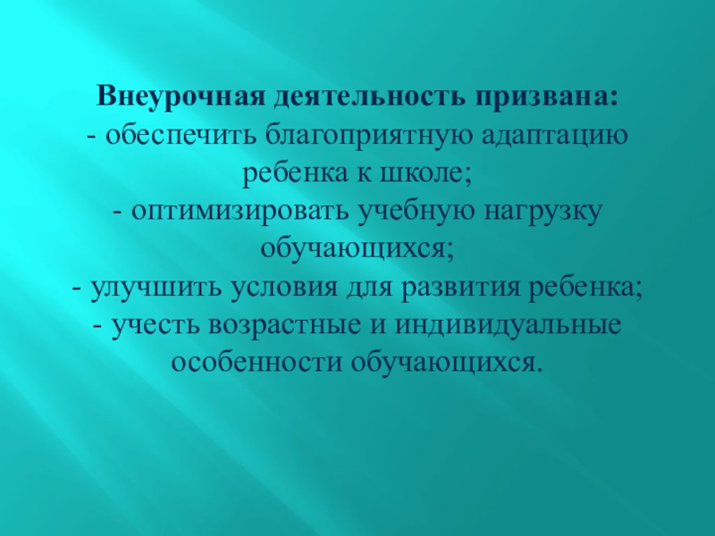 Слайд 4Внеурочная деятельность призвана: - обеспечить благоприятную адаптацию ребенка к школе; - оптимизировать