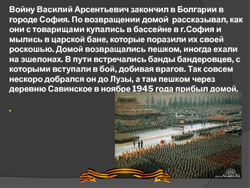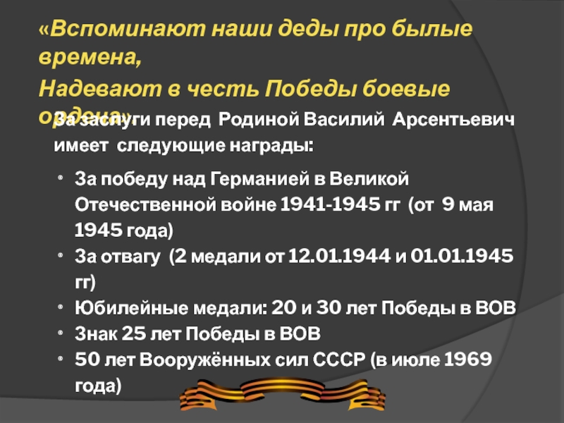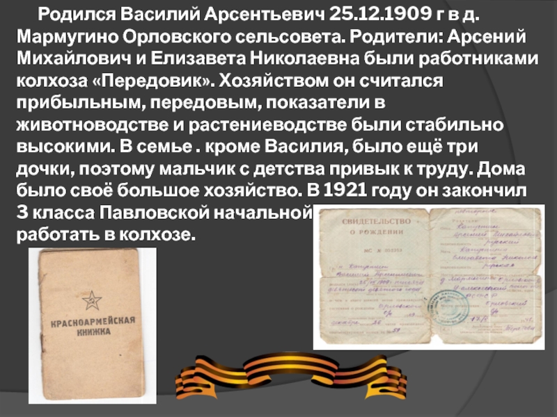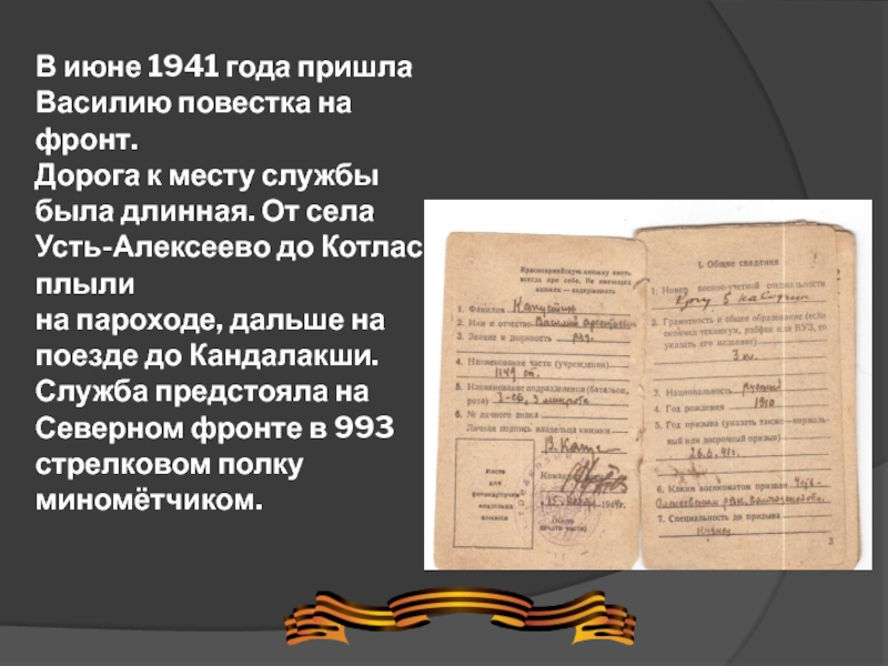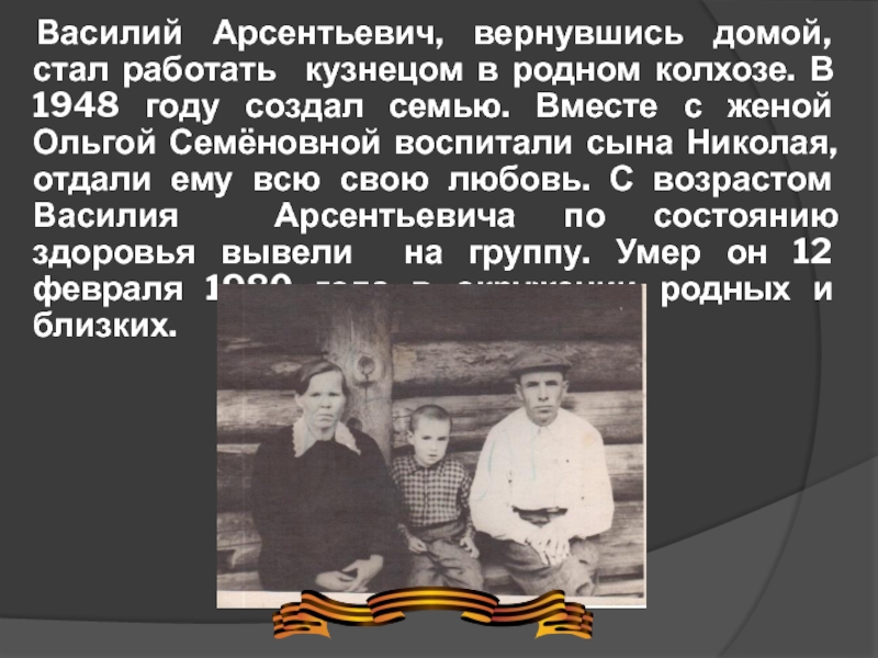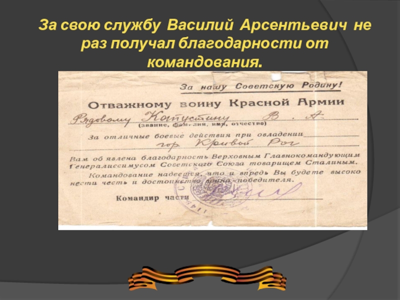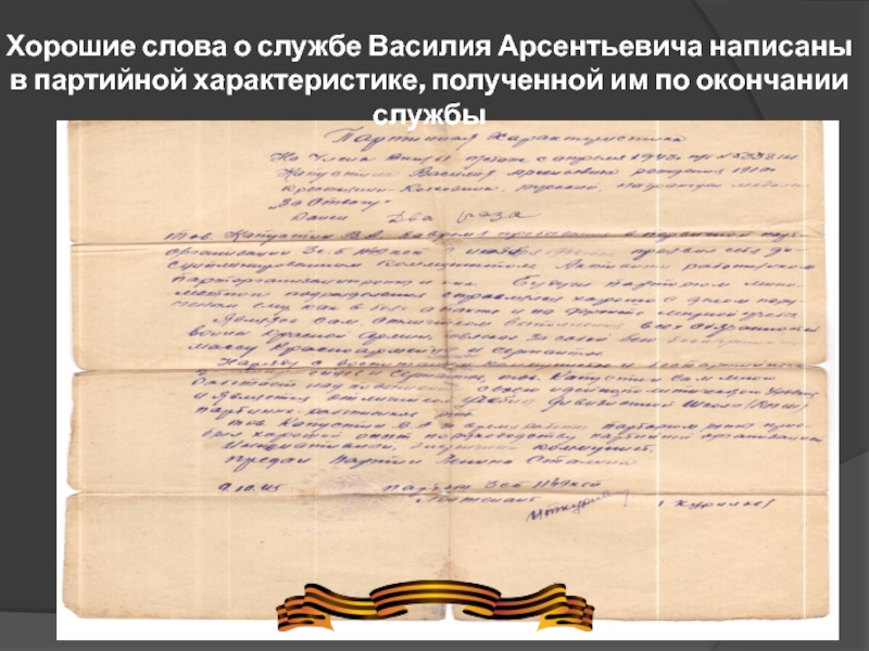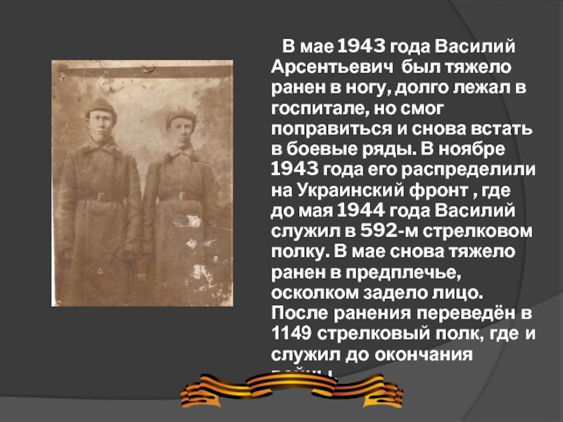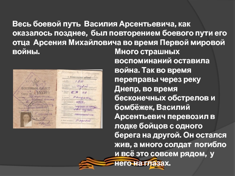Весь боевой путь Василия Арсентьевича, как оказалось позднее, был повторением боевого пути его отца Арсения Михайловича во время Первой мировой войны.