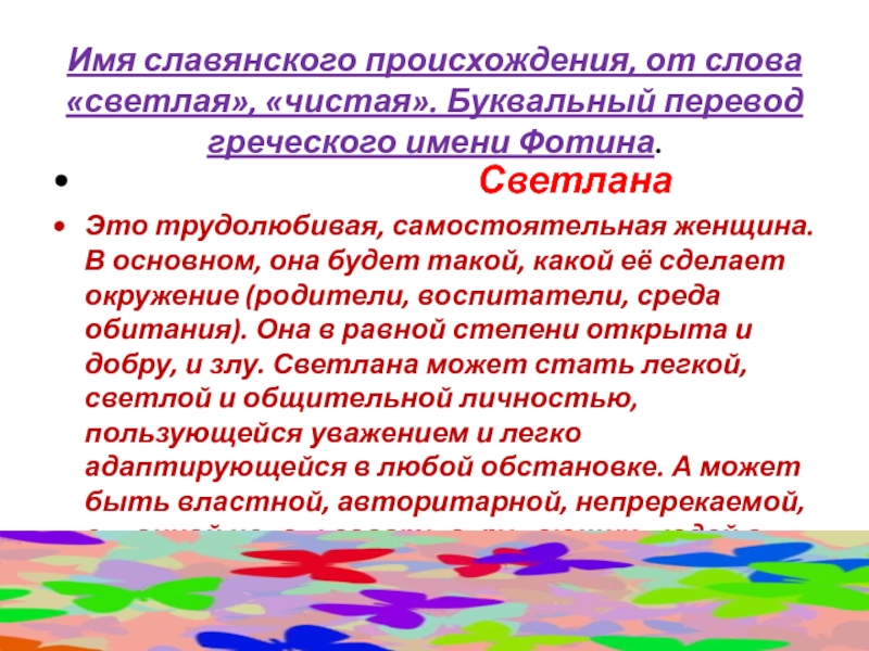 Это трудолюбивая, самостоятельная женщина. В основном, она будет такой, какой её сделает окружение (родители, воспитатели, среда обитания). Она в равной степени открыта и добру, и злу. Светлана может стать легкой, светлой и общительной личностью, пользующейся уважением и легко адаптирующейся в любой обстановке. А может быть властной, авторитарной, непререкаемой, склонной использовать окружающих людей в своих целях.