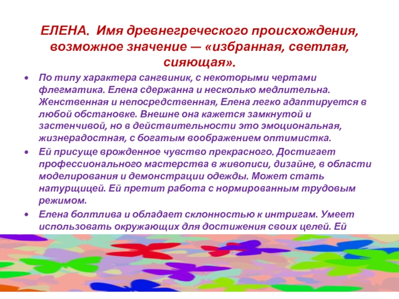 ЕЛЕНА. Имя древнегреческого происхождения, возможное значение — «избранная, светлая, сияющая».