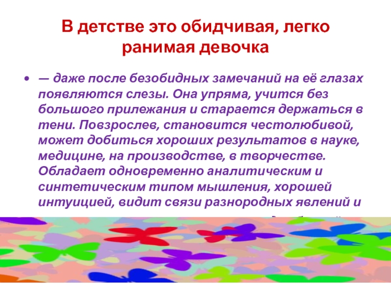 Слайд 53В детстве это обидчивая, легко ранимая девочка