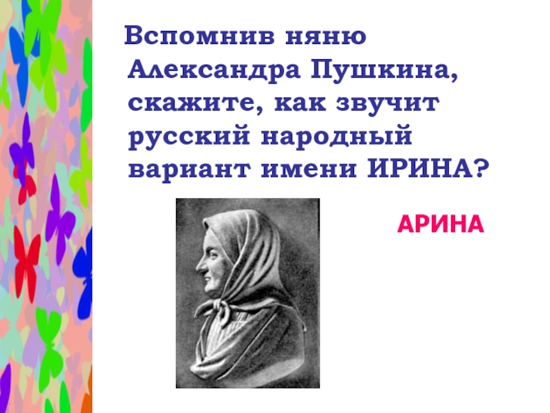 Слайд 14 Вспомнив няню Александра Пушкина, скажите, как звучит русский народный