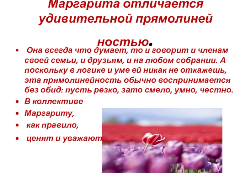 Слайд 45Маргарита отличается удивительной прямолинейностью.