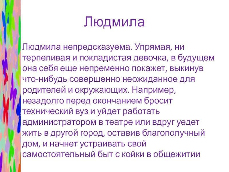 Людмила непредсказуема. Упрямая, ни терпеливая и покладистая девочка, в будущем она