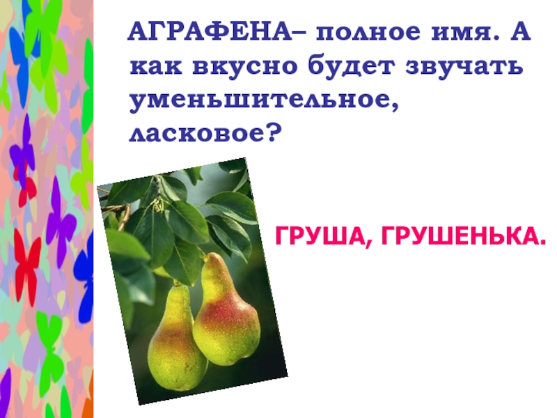 Слайд 39 АГРАФЕНА– полное имя. А как вкусно будет звучать уменьшительное, ласковое?